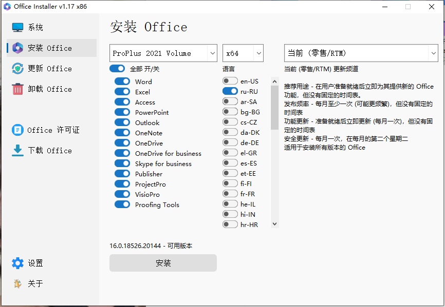 1、选择所需的Office版本、位深度与语言。 您可以制作一个完整的x86-x64发行版。要执行此操作,请在位深度选项卡中,选择All(全部)项(最低)。 点击下载按钮并选择一个文件夹 用于分发文件。 您可以选择程序的前一个会话的文件夹继续创建 不然将启动一个新的会话。