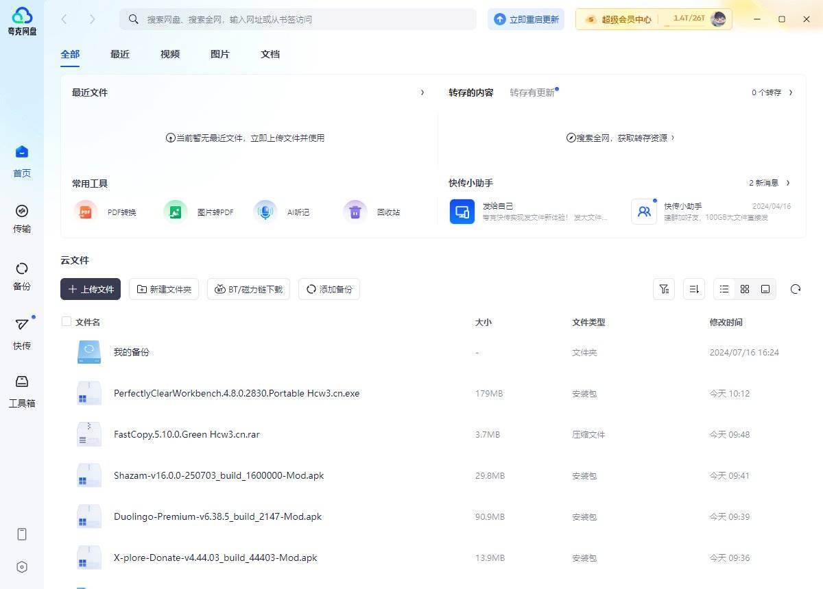 夸克网盘电脑版是一款好用高效的在线网盘工具,一款能够让每一个用户都能在这里一站式体验最简单的网盘服务,超大的会员10T空间,让用户可以在这里尽情存放各种资源,你想要的都能在这里快速下载。现在全网网盘参差不齐,其中老大哥百度网盘时代已经没落了,因为现在很多影视资源都是夸克的,要问为什么,还不是因为钱,夸克会员收费是百度网盘收费的1/3啊,便宜又好用。