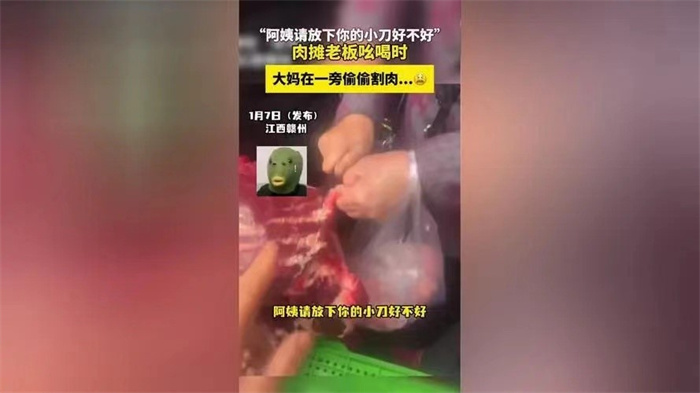近日在江西赣州发生了一起搞笑事件,一位肉摊老板正在卖肉的时候,发现有大妈在旁边用小刀偷切肉想带回家吃,老板制止了这位大妈。老板表示:“阿姨将你的小刀放下好不好?”这段视频被上传网络后也引起网友们的讨论,有网友发布观点称:“这位大妈的做法实在是不太地道。”
