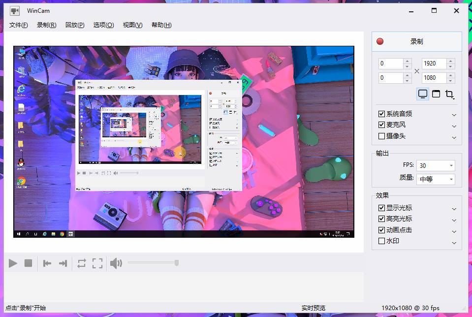 wincam中文破解版是一款小巧易用的屏幕录像软件,wincam破解版屏幕录像工具能够得心应手录制任何视频。wincam录屏软件提供多种录制方式,包括全屏,活动窗口,1080P高清区域,并且可以在录制沙盘之前预设好视频效果,如光标,点击动画,视频水印等,此外还具有视频编辑功能,这样你就可以在最短时间内获得不错的录制视频。
