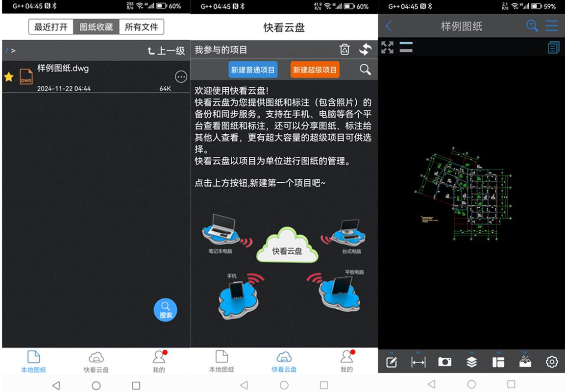 4. 云服务:内置的快看云盘允许用户将图纸和标注同步到电脑或与同事共享,便于团队协作和资料管理。