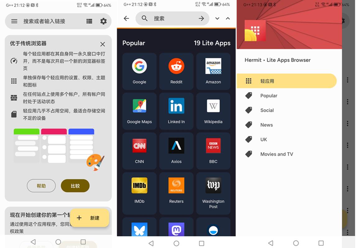 hermit高级版可以将很多大网站大应用创建成一个轻量级的应用,hermit app自带中文,零七资源网免费提供的是hermit破解版,免费使用所有功能,轻松将网页制作成本地应用程序,更轻便简洁好用。hermit中文版是一款基于 web 的 Lite 应用替换大型本地应用程序。hermit解锁版可以使您的浏览速度更快,以及保存数据,屏蔽广告,保护你的隐私,在夜间模式浏览,读者视图,并自支持为每个Lite应用程序定义超过20个不同的设置!什么是 Lite 应用程序?Lite 是快速、小巧的 Web 应用程序与出色 Android 的集成。