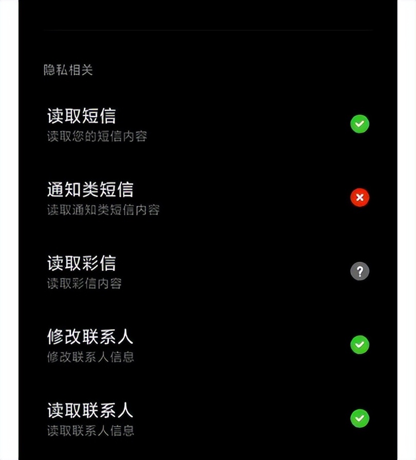 试想,如果短信界面被授权,APP可以轻而易举的知道你的验证码,如果你的银行卡被盗,那么是不是很容易就会造成财产损失?